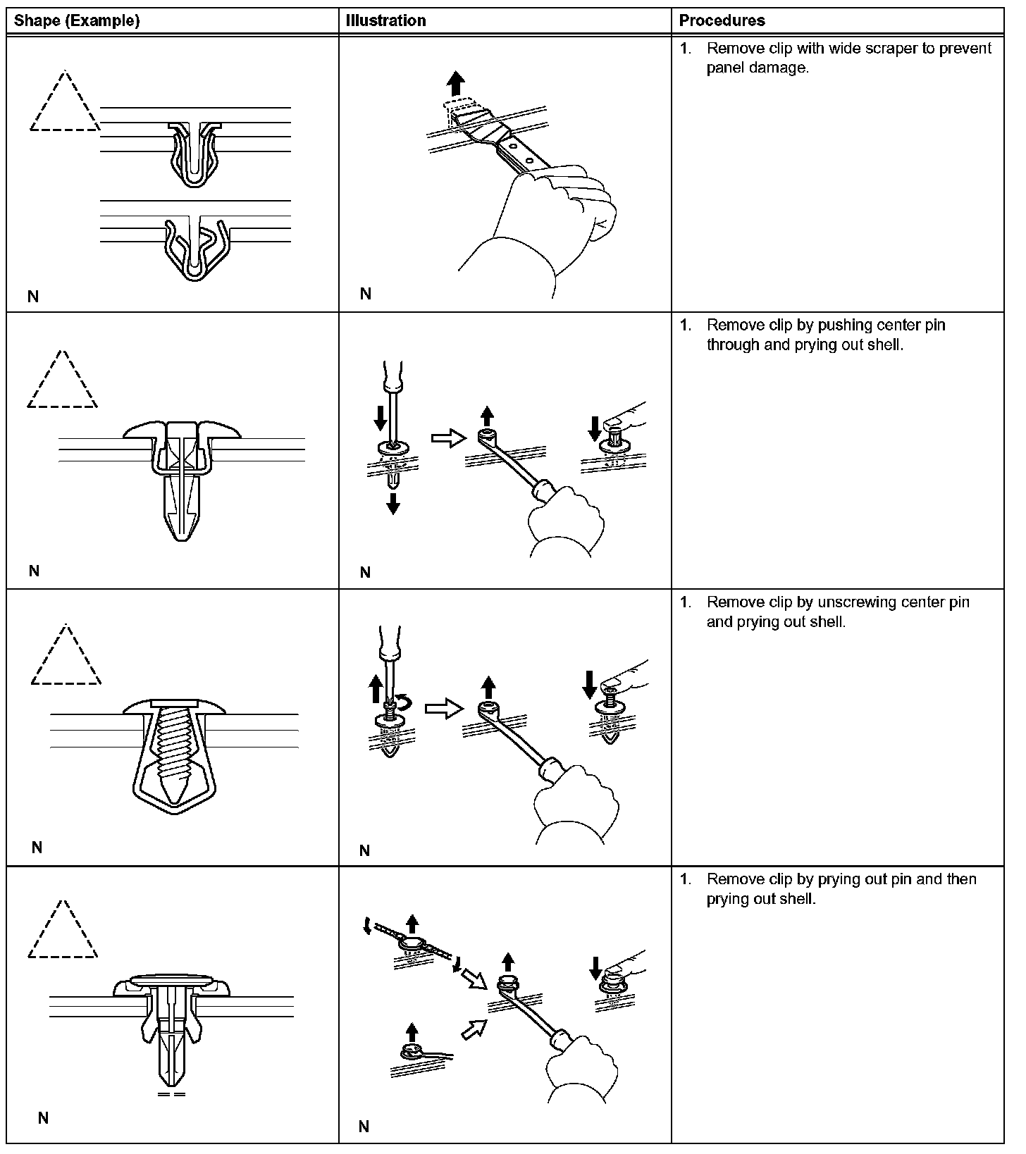 1. The removal and installation methods of typical clips used for vehicle body parts are shown in the table.