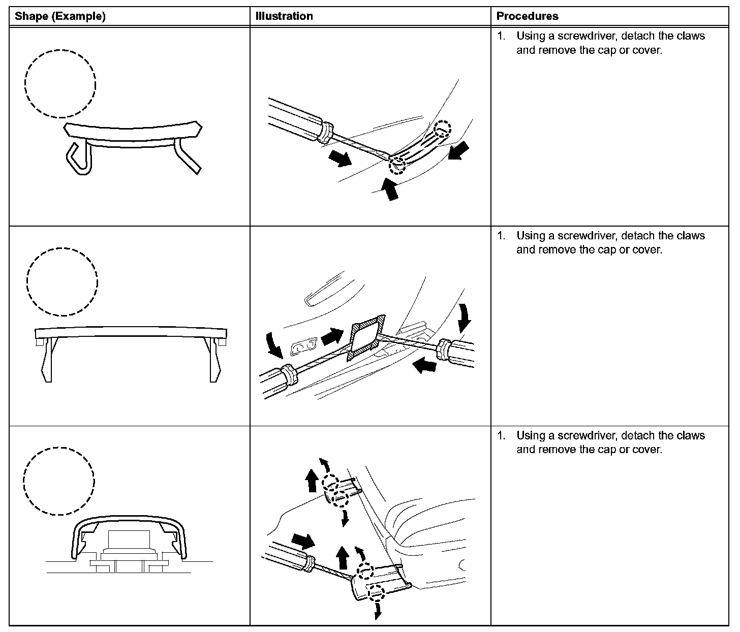 1. The removal and installation methods of typical claws used for vehicle body parts are shown in the table.
