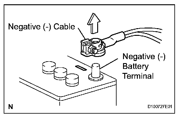 1. Before performing electronic work, disconnect the cable from the negative (-) battery terminal to prevent component and wire damage caused by accidental short circuits.