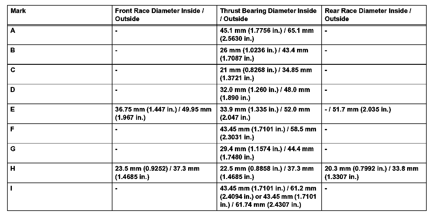New bearing: 0.98 to 1.57 Nm (10.0 to 16.0 kgf-cm, 8.7 to 13.9 inch lbs.)