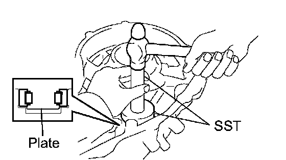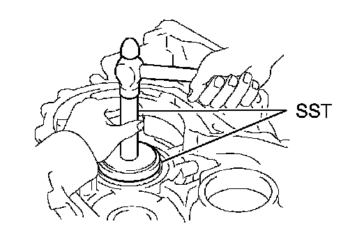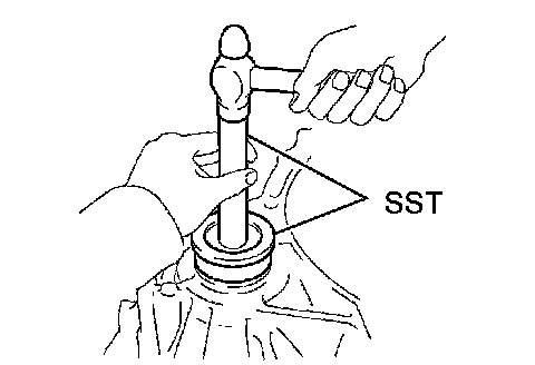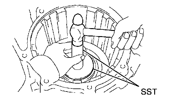 b. Using SST and a hammer, tap in the roller bearing into the transaxle case.