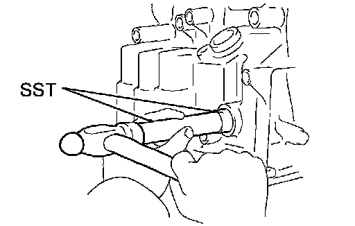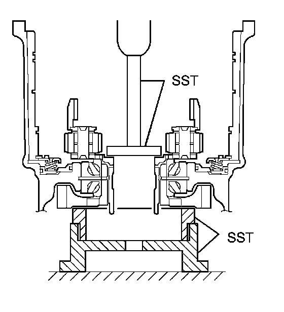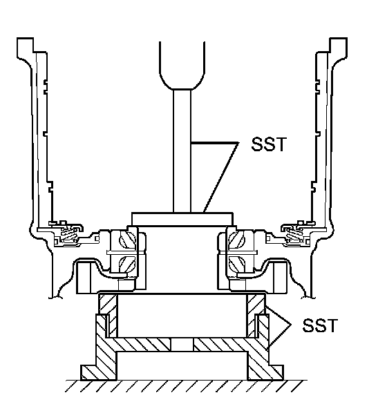 b. Using SST and a press, press in the tapered roller bearing to the transaxle housing.