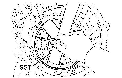b. Using SST, a press and screwdriver, install the snap ring. SST 09387-00070
