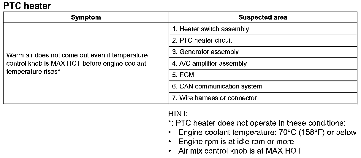 Problem Symptoms Table - PTC Heater:
