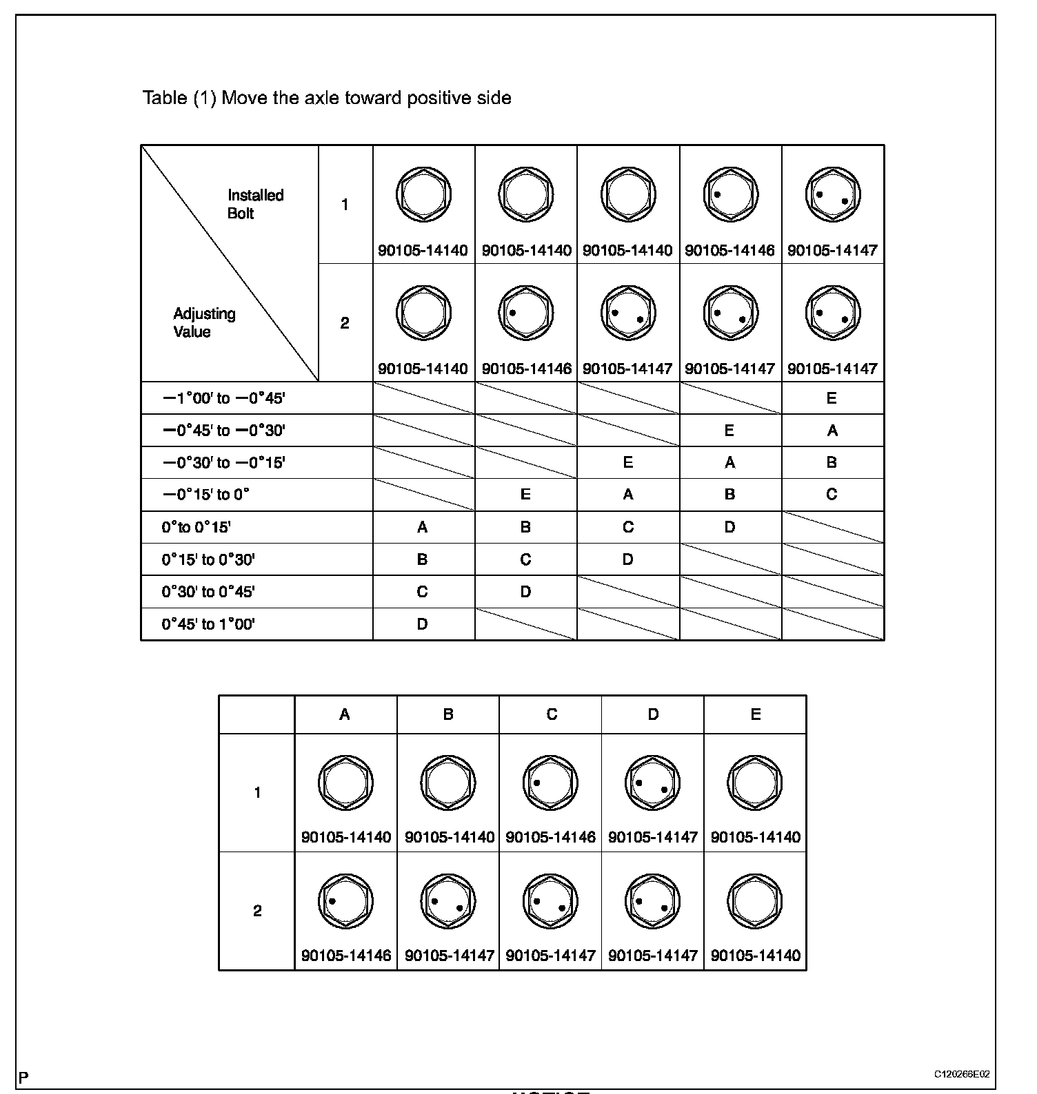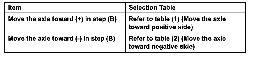 Check installed bolts combination. Select appropriate bolts from the table to adjust the camber to within the specified range.