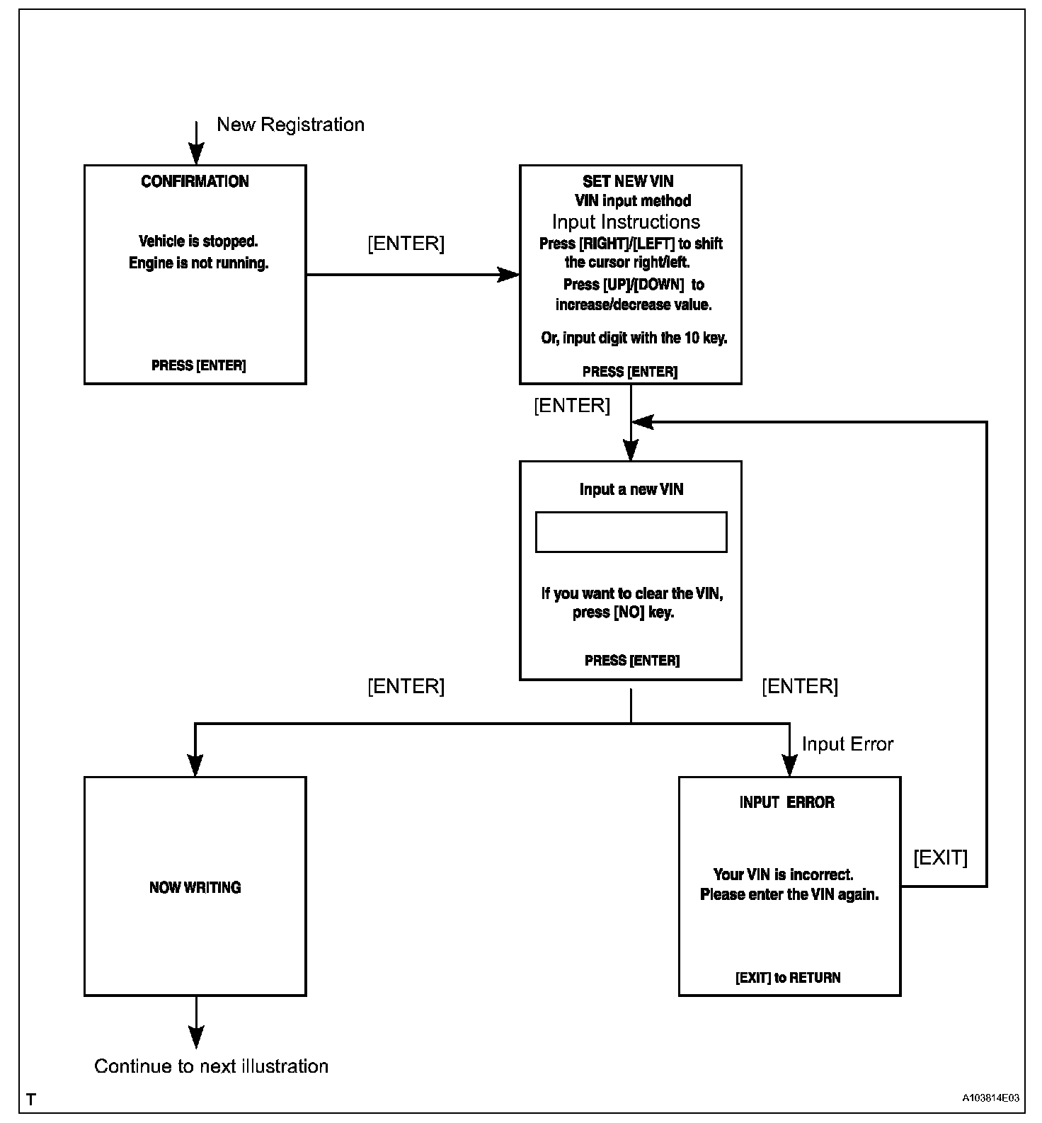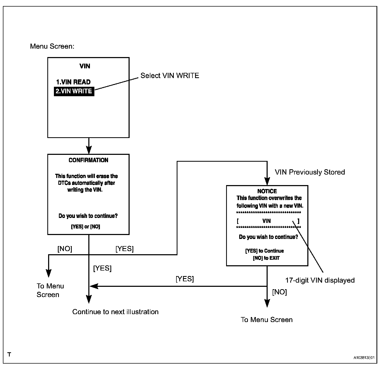 HINT: Below are the VIN writing instructions. Use the procedures and flowchart given. This process allows the VIN to be input into the ECM. If the ECM is changed, or the ECM VIN and vehicle VIN do not match, the VIN can be registered or overwritten in the ECM by following this procedure.