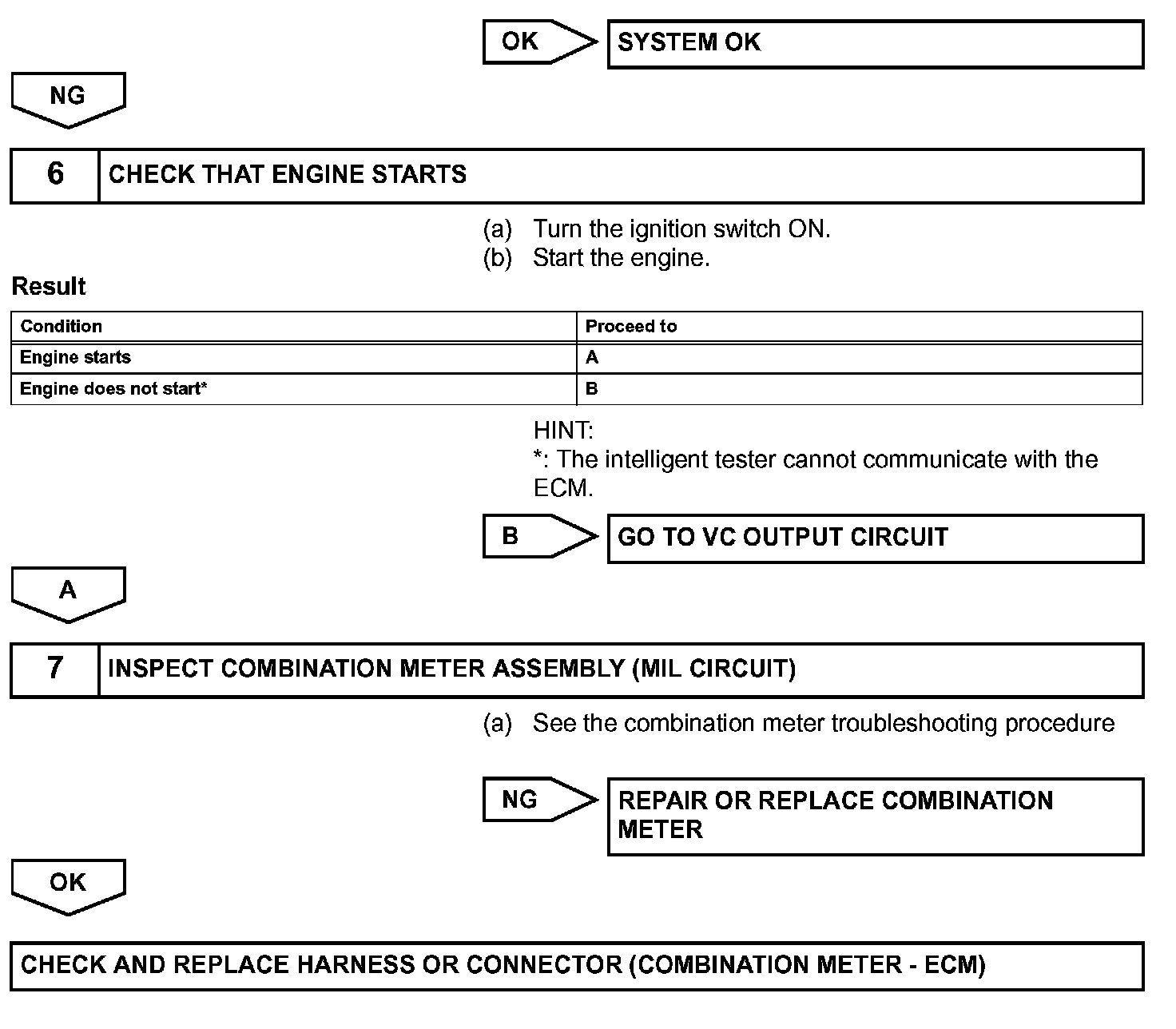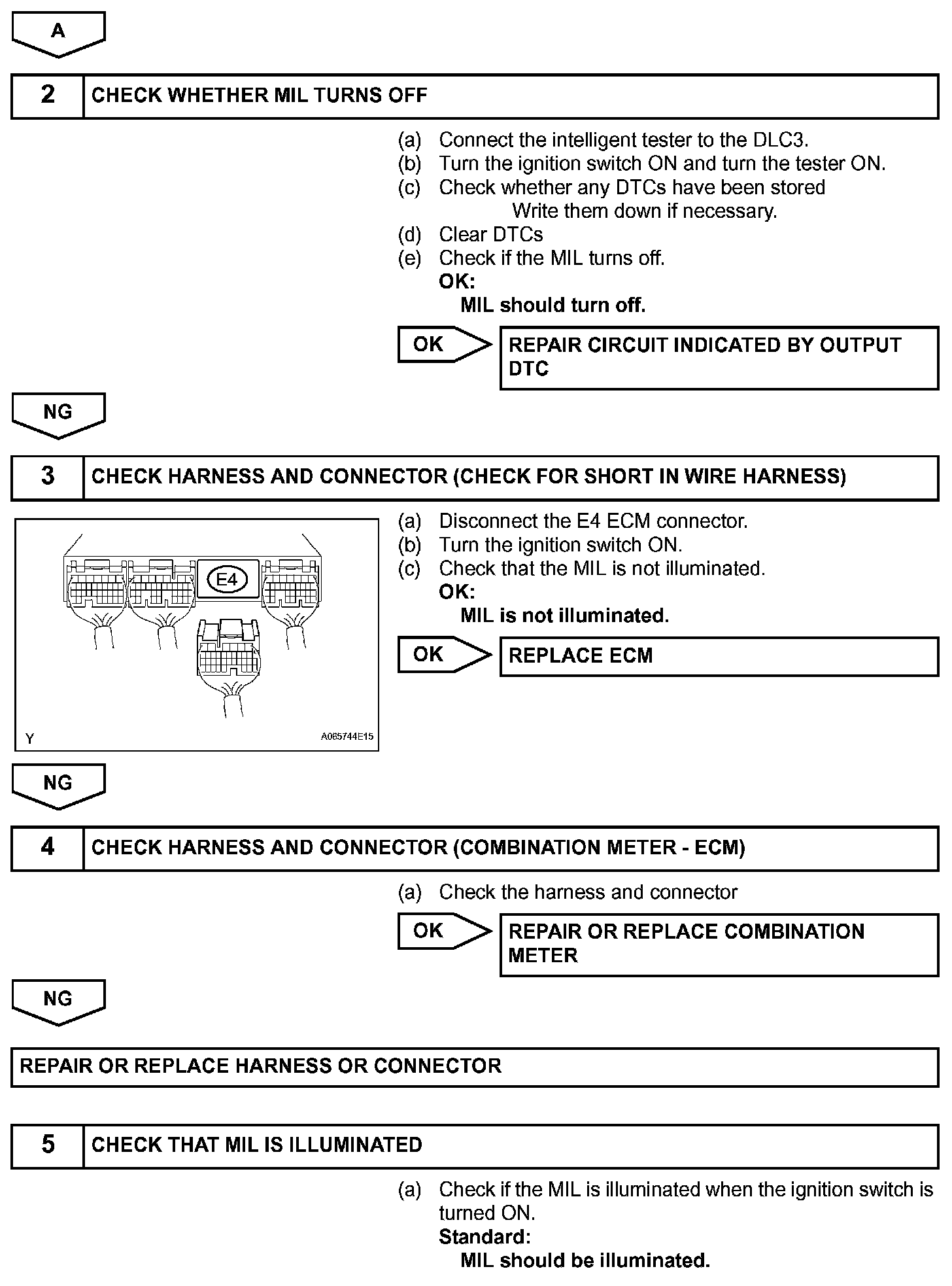 The MIL operation can be checked visually: When the ignition switch is first turned ON, the MIL should be illuminated and should then turn OFF. If the MIL remains illuminated or is not illuminated, conduct the following troubleshooting procedure using the intelligent tester.