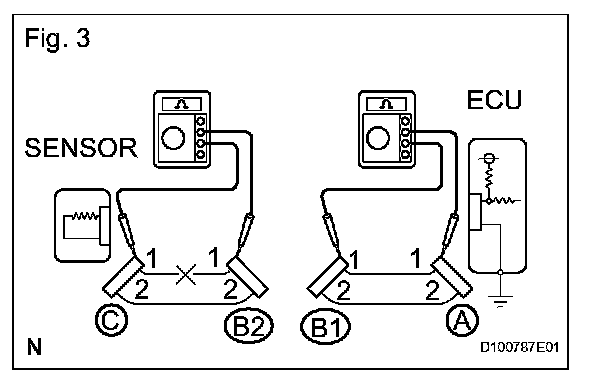 If the results match the examples above, an open circuit exists in the wire harness between terminal 1 of connector B and terminal 1 of connector C.