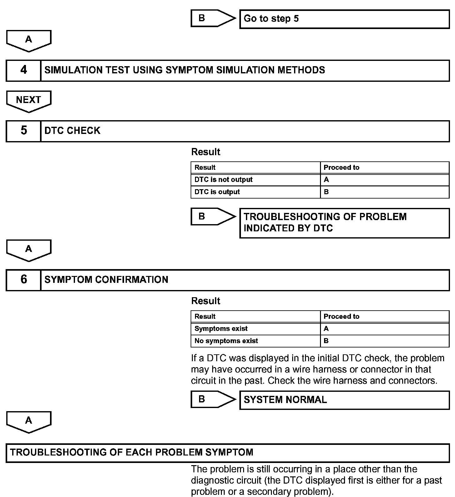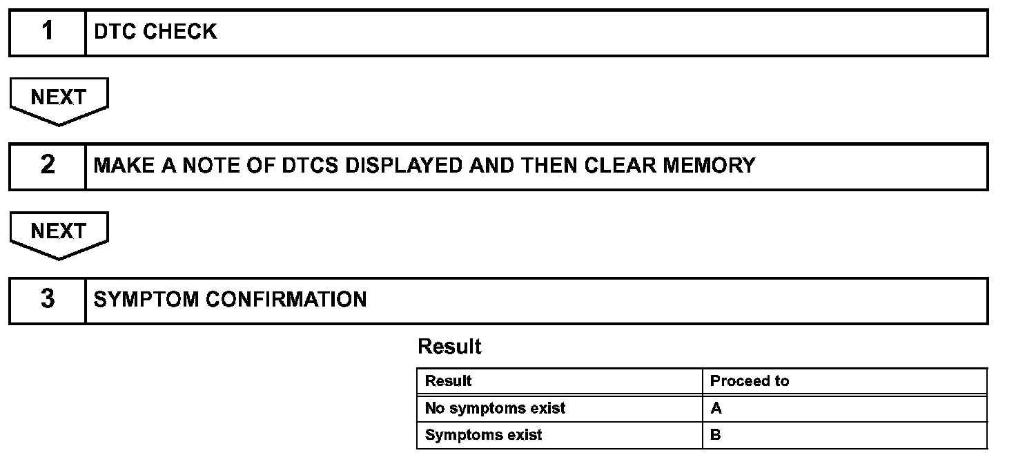 - In the DTC check, it is very important to determine whether the problem indicated by the DTC is either: 1) still occurring, or 2) occurred in the past but has since returned to normal. In addition, the DTC should be compared to the problem symptom to see if they are related. For this reason, DTCs should be checked before and after confirmation of symptoms (i.e., whether or not problem symptoms exist) to determine current system conditions, as shown in the flowchart.