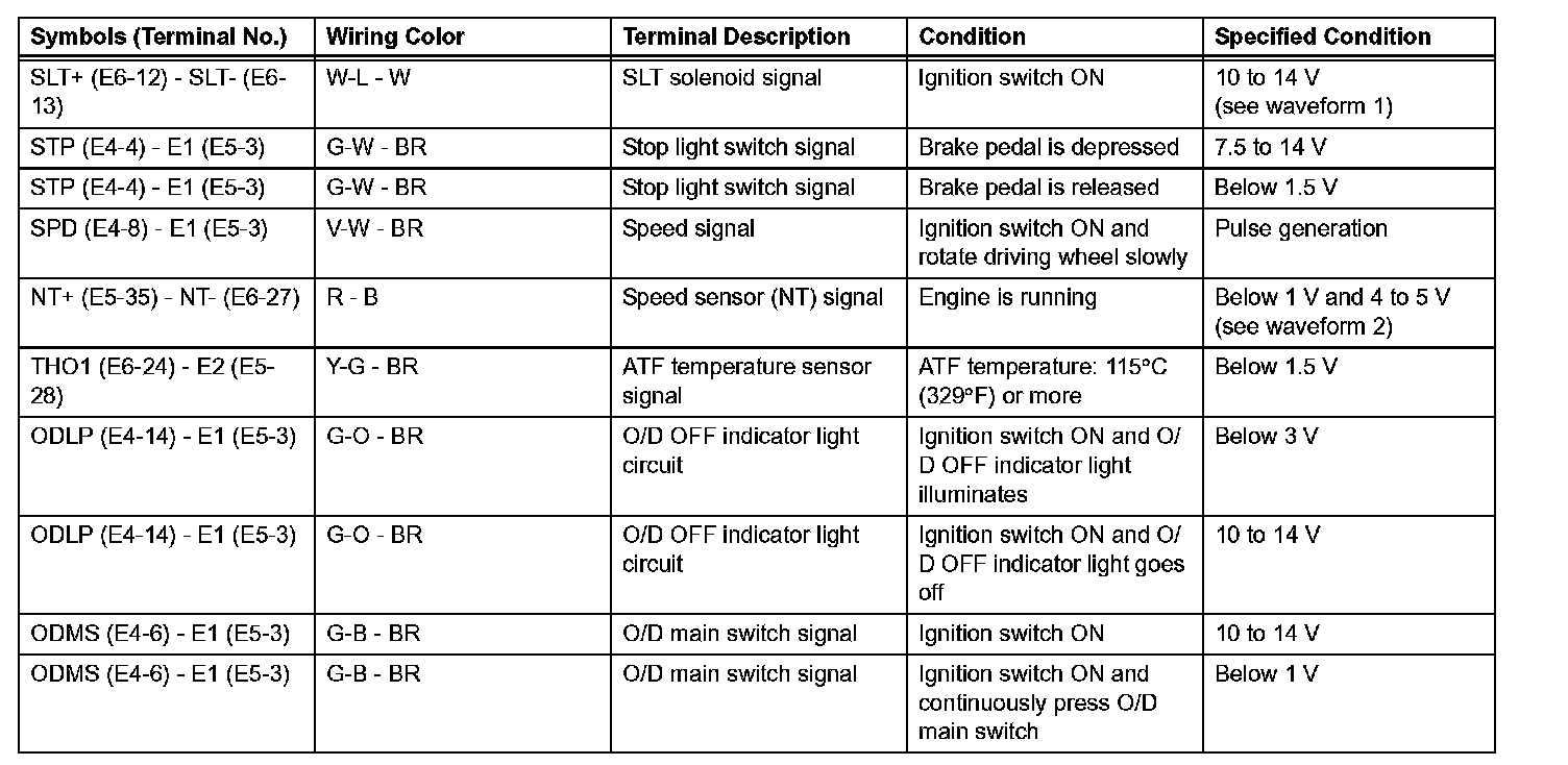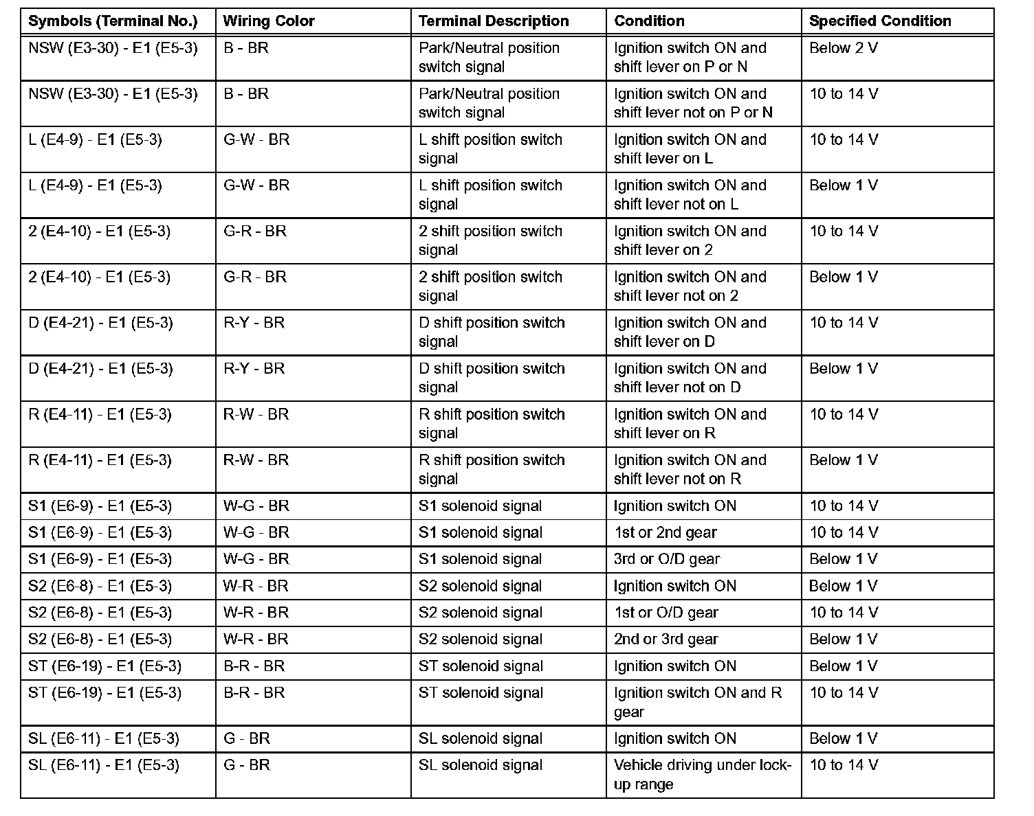 Look under "Symbols (Terminal No.)" for the terminals to be inspected. The standard voltage between the terminals is shown under "Specified Condition".