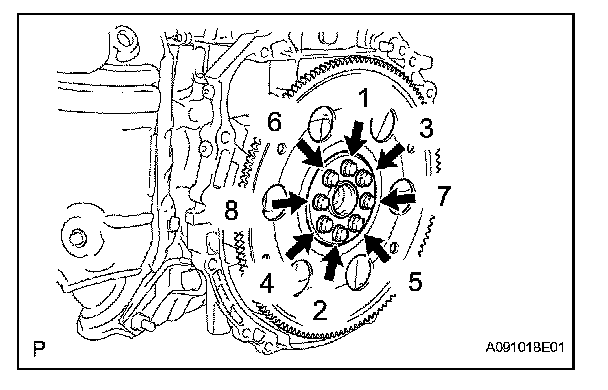 Using several steps, uniformly install and tighten the 8 bolts in the sequence shown in the illustration.