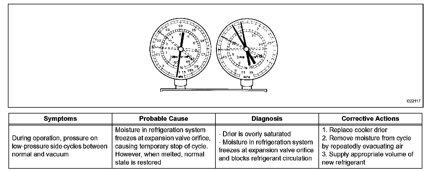 2. The A/C system periodically changes between normal and improper function due to moisture in the refrigerant system.