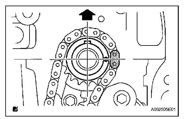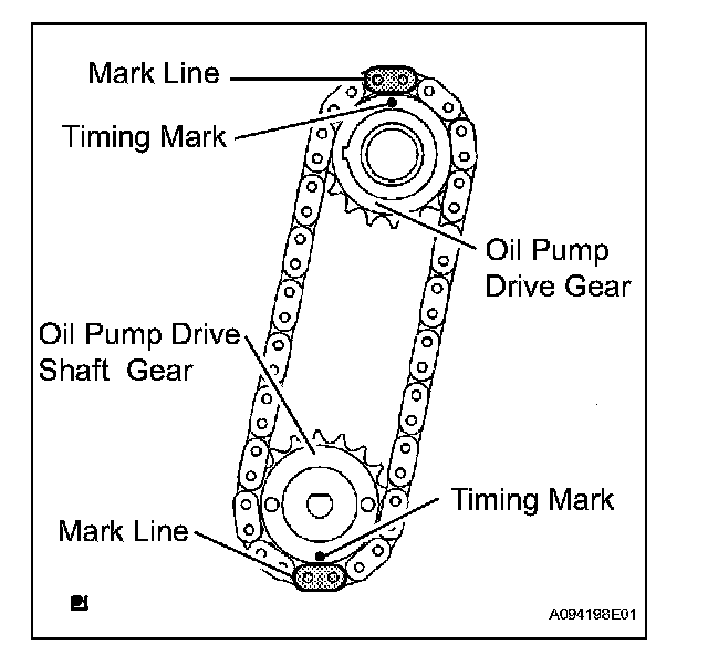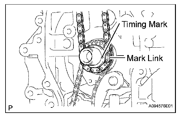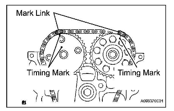 (b) Install the chain onto the crankshaft timing sprocket with the gold or orange mark link aligned with the timing mark on the crankshaft timing gear.