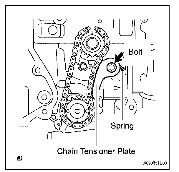 (f) Insert the damper spring into the adjusting hole, then install the chain tensioner plate with the bolt.