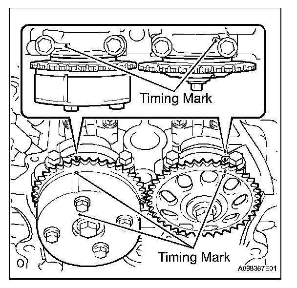 (1) Turn the camshafts with a wrench in the hexagonal lobe to align the timing marks of the camshaft timing gear with each timing mark located on the No. 1 and No. 2 bearing caps as shown in the illustration.