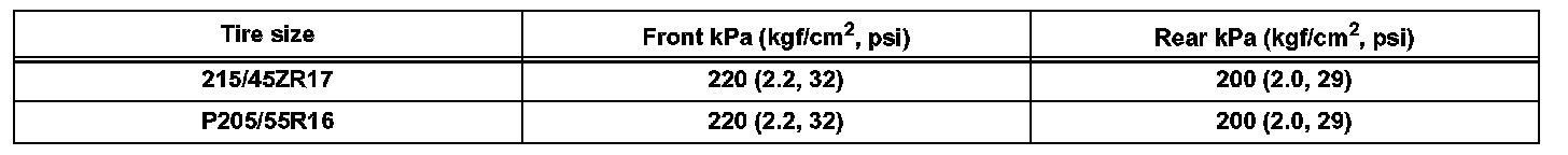 NOTICE: Perform the tire pressure adjustment after the vehicle has sufficiently cooled down. If the vehicle is not sufficiently cooled down, increase the air pressure by 20 to 30 kPa (0.2 to 0.3 kgf/cm2, 2.9 to 4.3 psi) above the specified value.