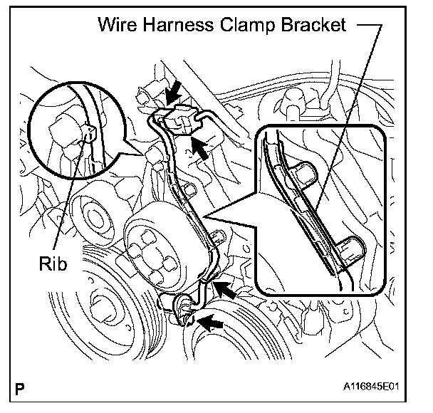 f. Confirm that the wire harness of the sensor is secured to the wire harness clamp bracket through the back of the rib of the timing chain cover.