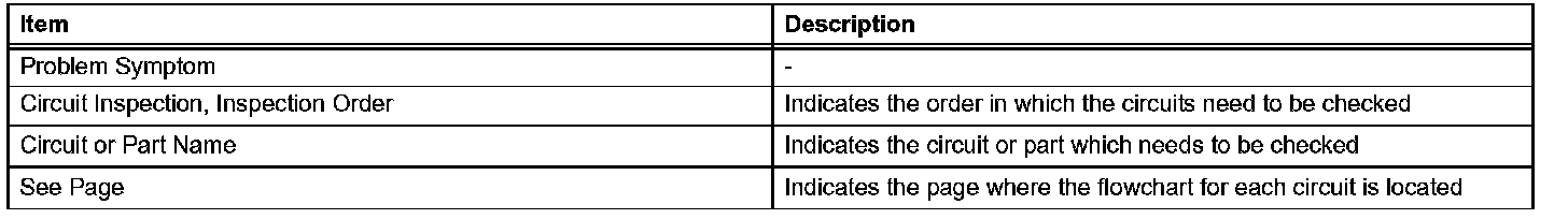 When a "Normal" code is output during a DTC check but the problem is still occurring, use the Problem Symptoms Table. The suspected areas (circuits or parts) for each problem symptom are in the table. The suspected areas are listed in order of probability. A description of each of the chart's columns are given.