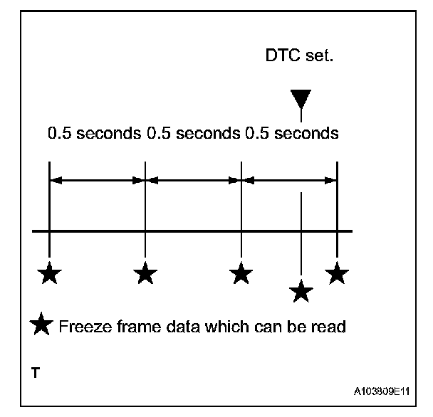 The ECM records engine conditions in the form of freeze frame data every 0.5 seconds. Using the intelligent tester, 5 separate sets of freeze frame data can be checked.