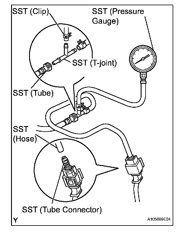 e. Install SST (pressure gauge) and the fuel tube connector using SST as shown in the illustration.