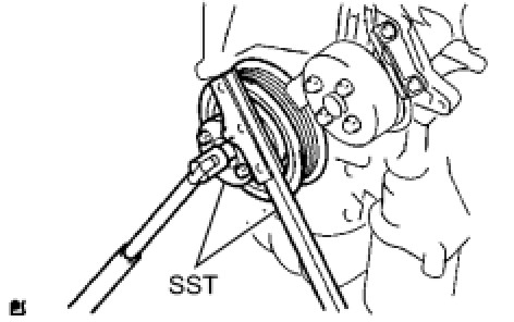 HINT: Disconnect the compressor together with the low-pressure and high-pressure hoses, then secure it to the vehicle side using rope.