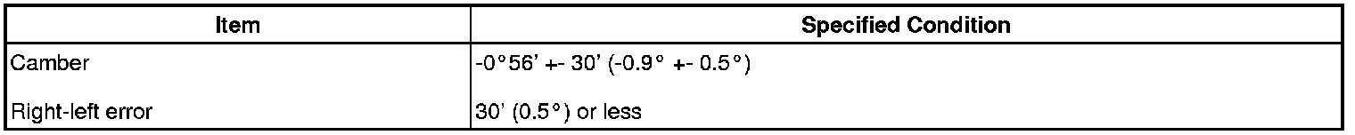 - If the measured value is not within the specified range, inspect the suspension parts for damage and/or wear and replace them if necessary because camber is not adjustable.