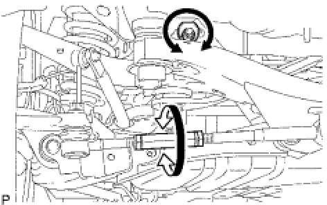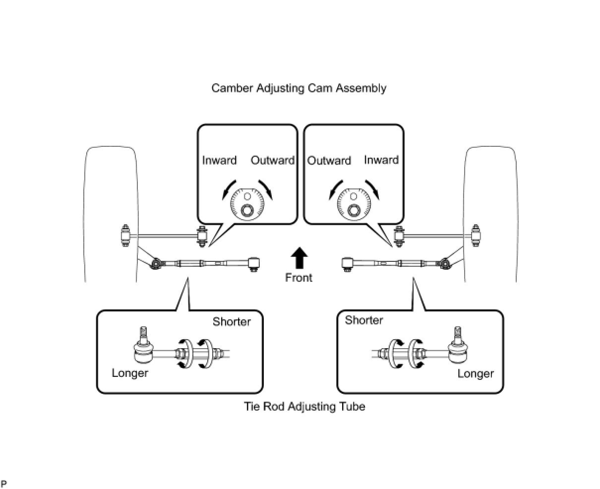 - If the difference exceeds the specified value, adjust it by turning the camber adjusting cam and tie rod adjusting tube.