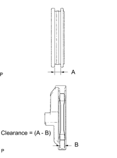 (a) Using vernier calipers, measure the width of the No. 3 transmission hub sleeve groove (A) and the thickness of the claw part on the No. 3 gear shift fork (B), and calculate the clearance.