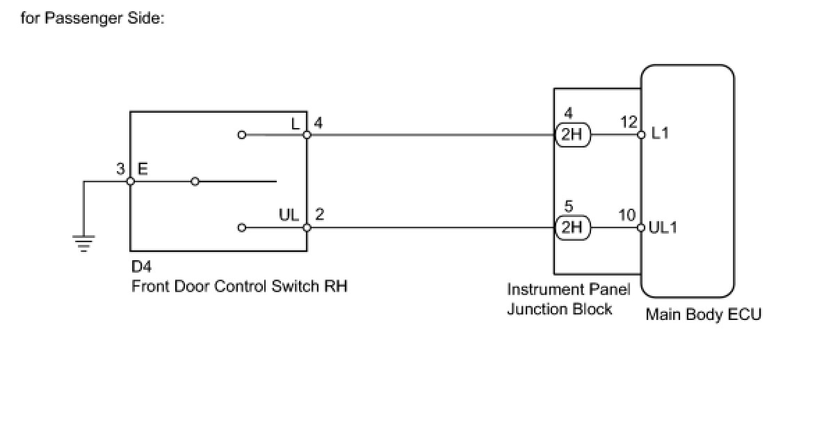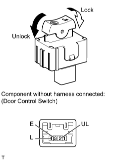 - When the lock side of the door control switch is pressed, continuity is established between terminal 4 and terminal 3 on the switch. When the unlock side of the switch is pressed, continuity is established between terminal 2 and terminal 3. Terminals L1 and UL1 on the main body ECU are connected to the door control switch, and door lock/unlock request signals (by door control switch operation) are input to the main body ECU. The main body ECU constantly applies voltage to terminal 4 on the door control switch via terminal L1. When the door control switch is operated to lock all doors, current flows from terminal L1 to terminal 4. The main body ECU determines that this is a door lock request signal input. The main body ECU also applies constant voltage to terminal 2 on the door control switch via terminal UL1. When the door control switch is operated to unlock the doors, current flows from terminal UL1 to terminal 2. The main body ECU determines that this is a door unlock request signal input.