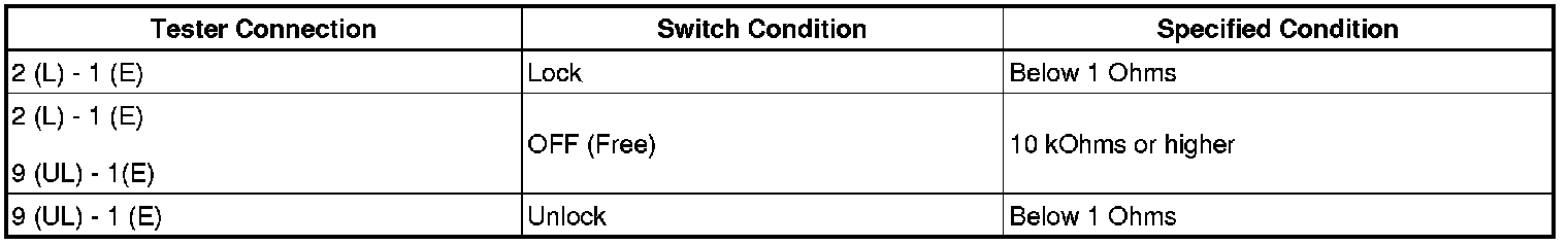 - When the lock side of the door control switch is pressed, continuity is established between terminal 2 and terminal 1 on the switch. When the unlock side of the switch is pressed, continuity is established between terminal 9 and terminal 1. Terminals L1 and UL1 on the main body ECU are connected to the door control switch, and door lock/unlock request signals (by door control switch operation) are input to the main body ECU. The main body ECU constantly applies voltage to terminal 2 of the door control switch via terminal L1. When the door control switch is operated to lock all doors, current flows from terminal L1 to terminal 2. The main body ECU determines that this is a door lock request signal input. The main body ECU also applies constant voltage to terminal 9 on the door control switch via terminal UL1. When the door control switch is operated to unlock the doors, current flows from terminal UL1 to terminal 9. The main body ECU determines that this is a door unlock request signal input.