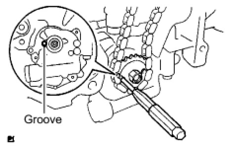 (g) Align the adjusting hole on the oil pump drive shaft sprocket with the groove on the oil pump.