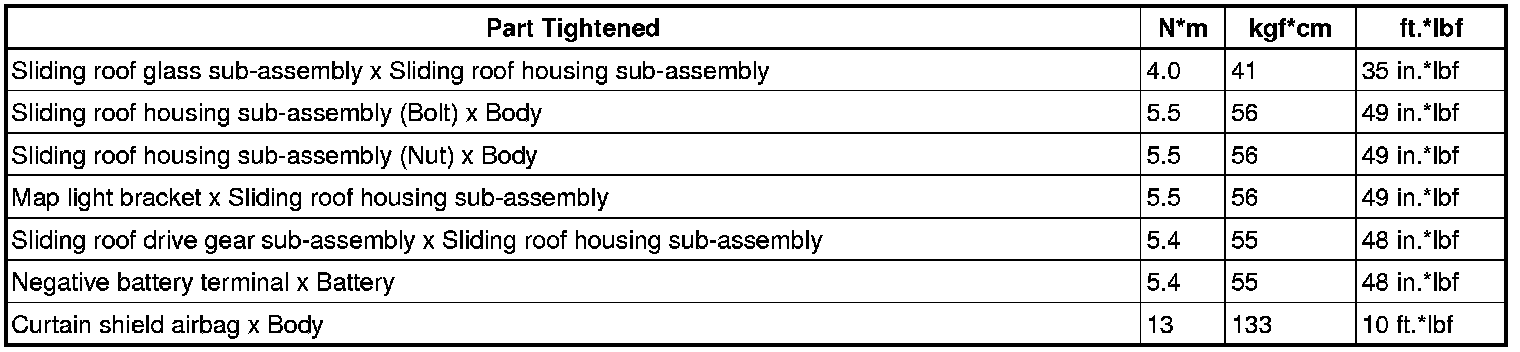 SERVICE SPECIFICATIONS: SLIDING ROOF: TORQUE SPECIFICATIONS