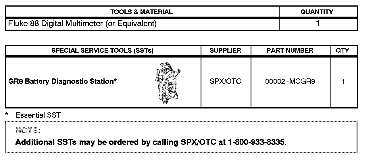 1. Before proceeding, determine the battery state of charge (SOC) using the GR8 Battery Diagnostic Station. If necessary, charge or replace the battery.