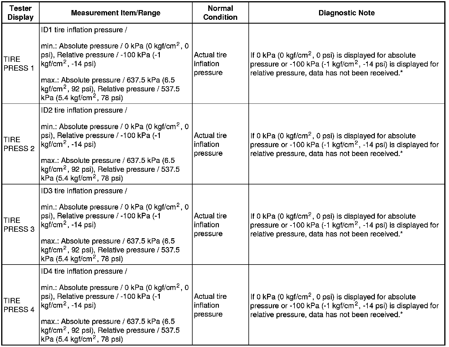 - The initialization is complete when the DATA LIST "TIRE PRESS" or "ID Tire Inflation Pressure" display shows the correct pressures.