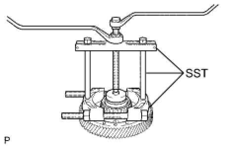 (b) Using SST, remove the rear tapered roller bearing (inner race) from the front differential case.