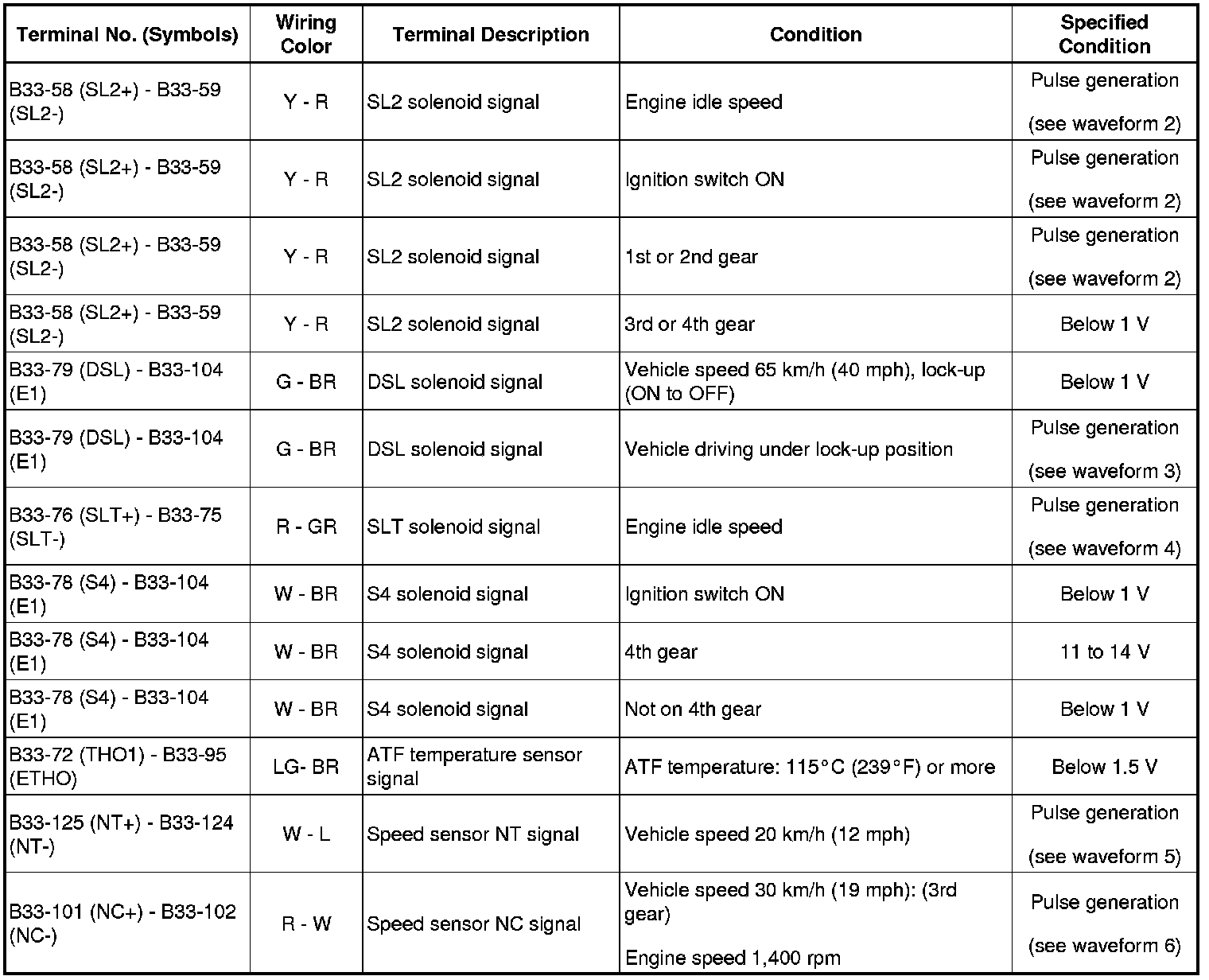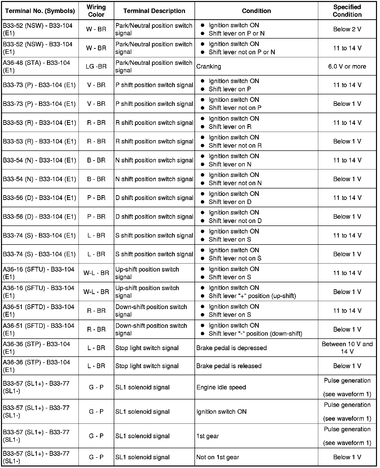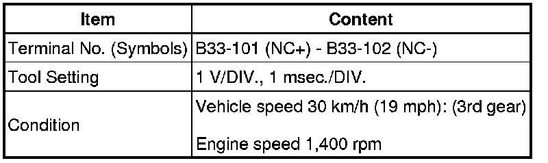 In the table, first follow the information under "Condition". Look under "Terminal No. (Symbols)" for the terminals to be inspected. The standard voltage between the terminals is shown under "Specified Condition".