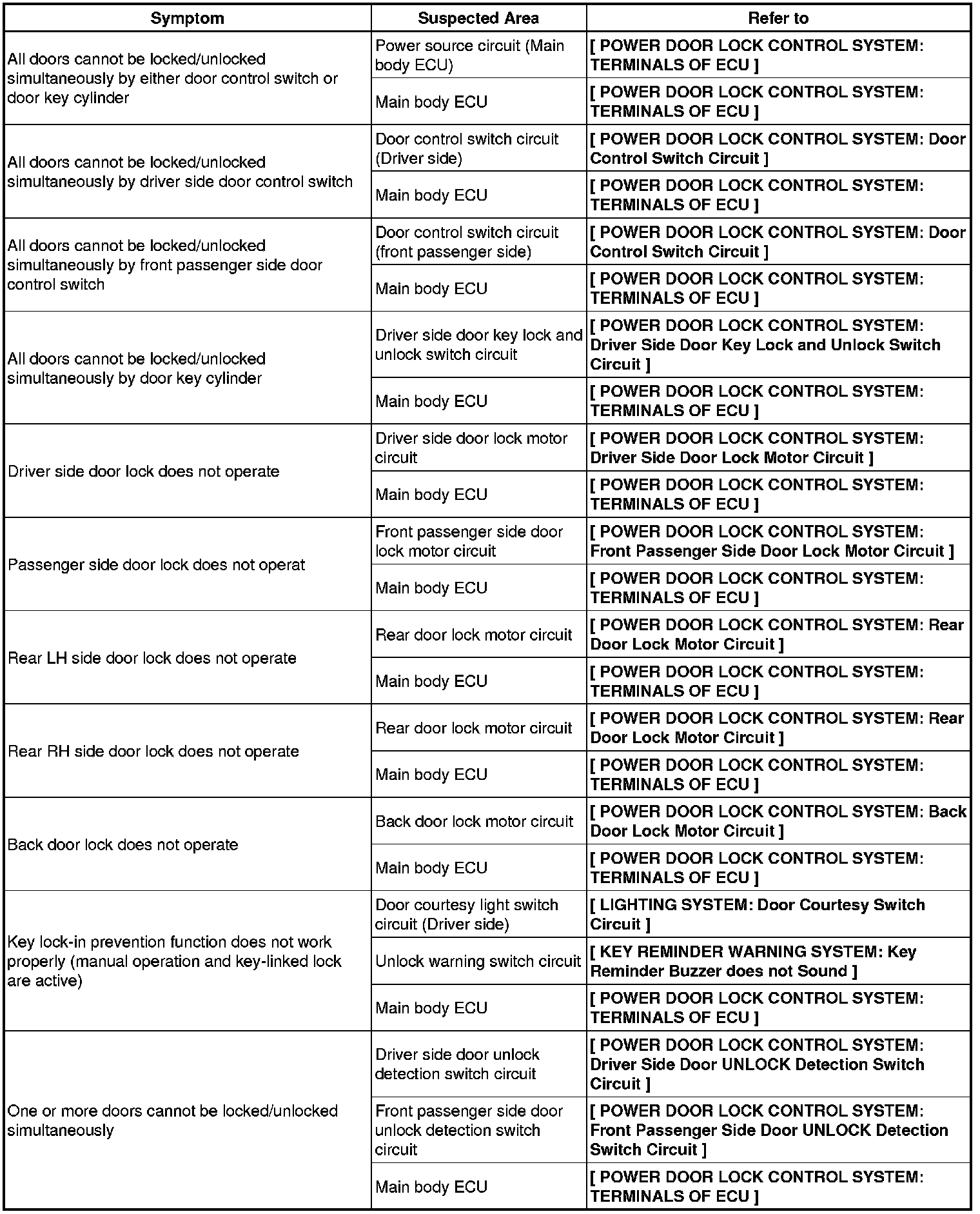 DOOR LOCK: POWER DOOR LOCK CONTROL SYSTEM: PROBLEM SYMPTOMS TABLE