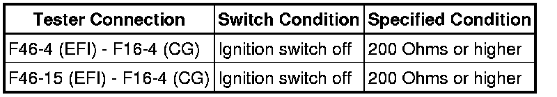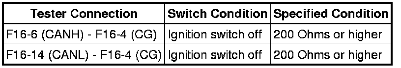 There may be a short circuit between the CAN bus line and GND when no resistance exists between terminals 6 (CANH) and 4 (CG) or terminals 14 (CANL) and 4 (CG) of the DLC3.