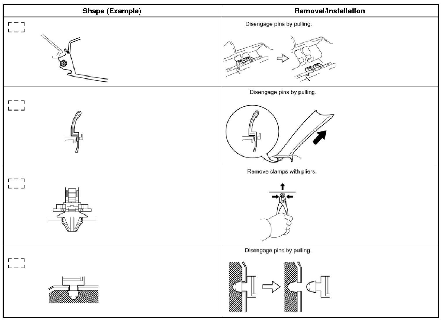 (1) The removal and installation methods of typical clips used for vehicle body parts are shown in the table below.