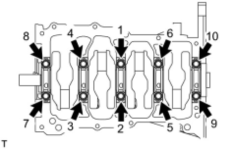 Install and uniformly tighten the 10 main bearing cap bolts in the sequence shown in the illustration.
