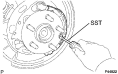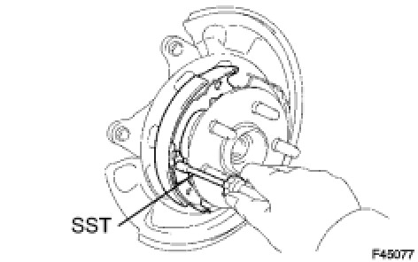 (c) Using SST, install the No. 1 parking brake shoe with the parking brake shoe hold-down compression spring and parking brake shoe hold-down spring pin.