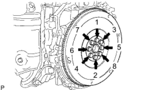 Using several steps, uniformly install and tighten the 8 bolts in the sequence shown in the illustration.
