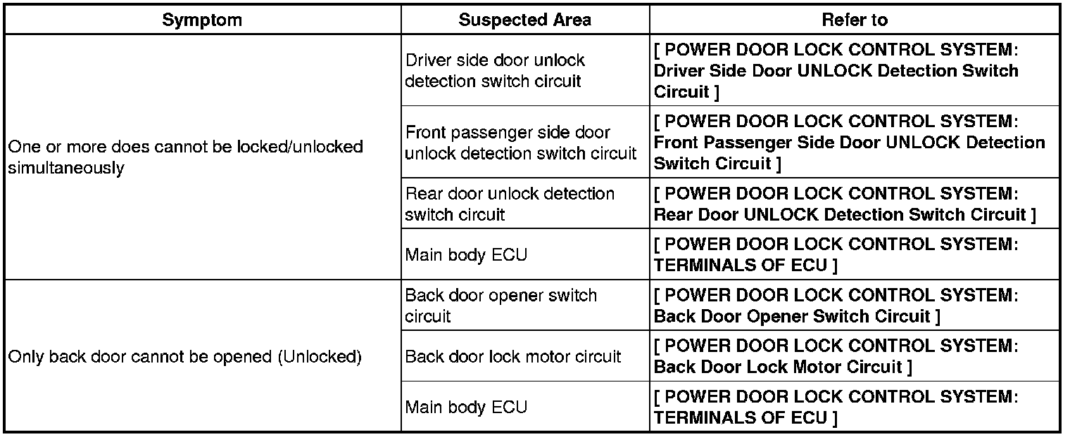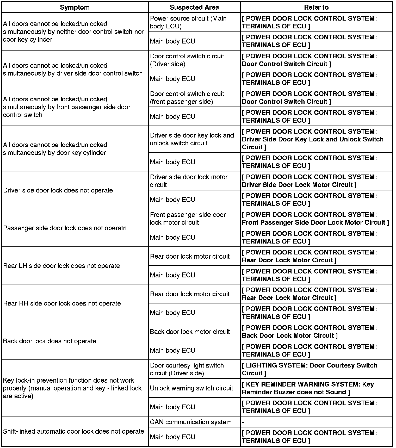 DOOR LOCK: POWER DOOR LOCK CONTROL SYSTEM: PROBLEM SYMPTOMS TABLE