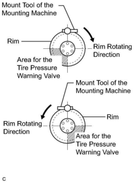 (c) Set the wheel disc into the mounting machine and install the lower tire bead. Position the main body of the tire pressure warning valve and transmitter in the shaded area shown in the illustration.
