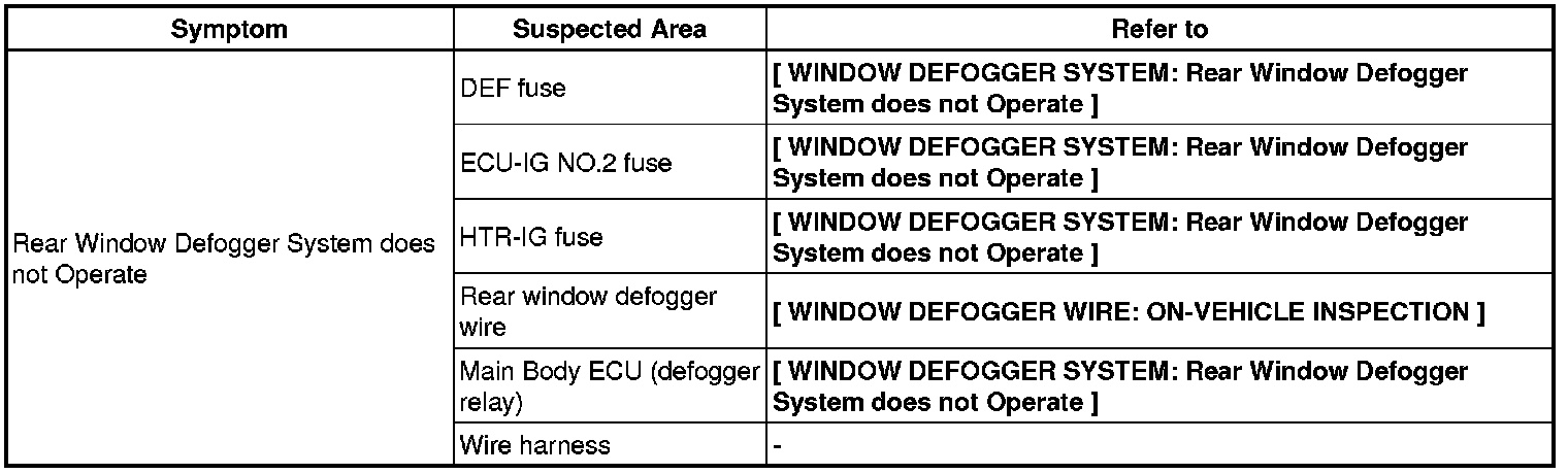/ WINDOWGLASS: WINDOW DEFOGGER SYSTEM: PROBLEM SYMPTOMS TABLE