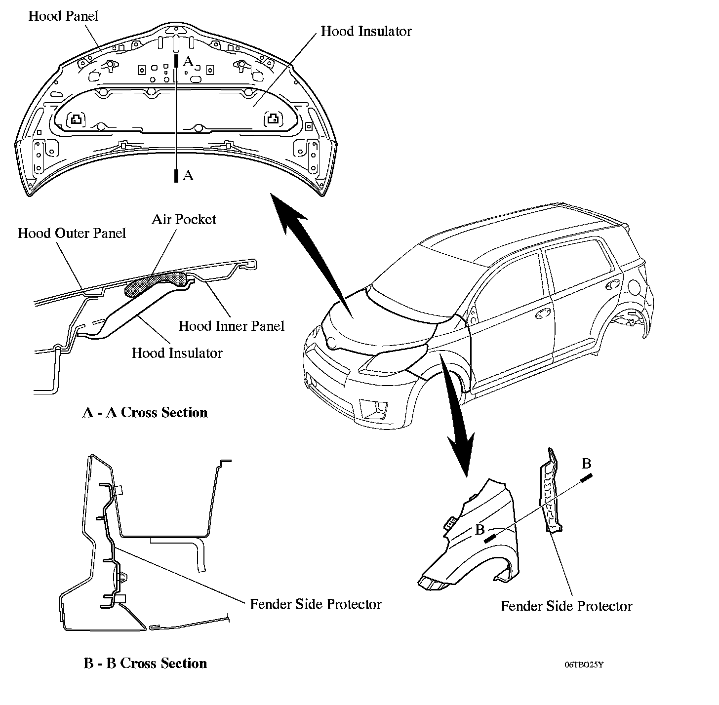 ^ In addition to the hood insulator provided on the rear of the hood panel, a two-layer construction is used with a layer of air between the hood panel and insulator. This provides an excellent sound insulation ability.