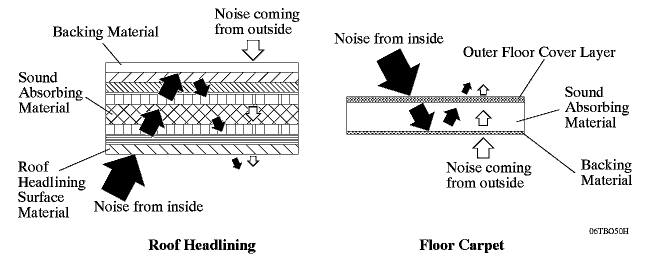 ^ The hybrid type floor carpet consists of three layers: the outer floor cover layer, sound absorbing material and backing material. Noise from inside the cabin enters through the outer floor cover layer and the sound absorbing material absorbs it. Noise coming from outside the cabin is insulated by the backing material.