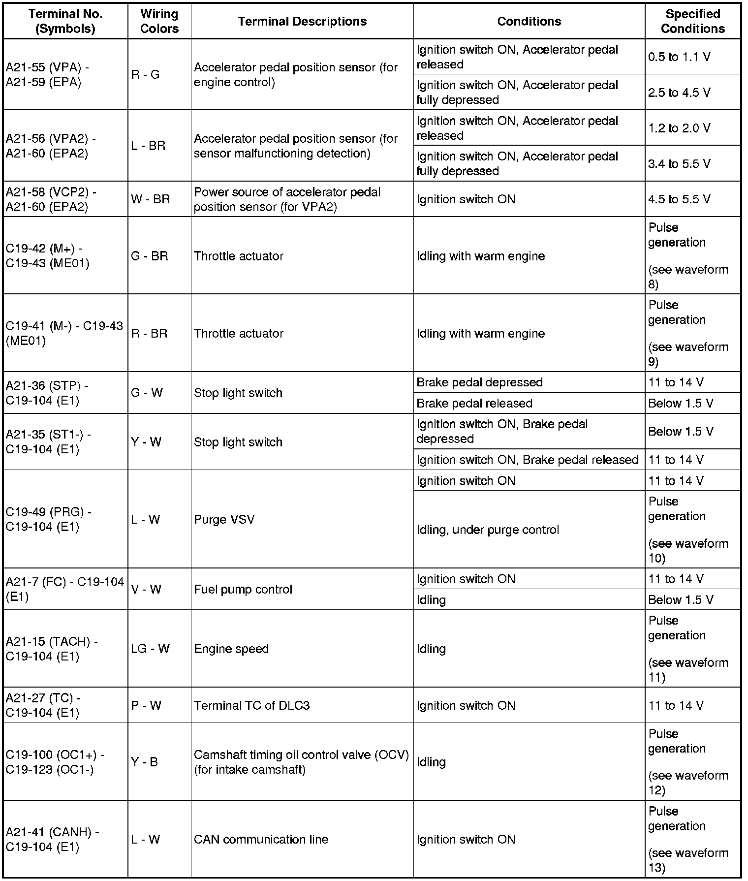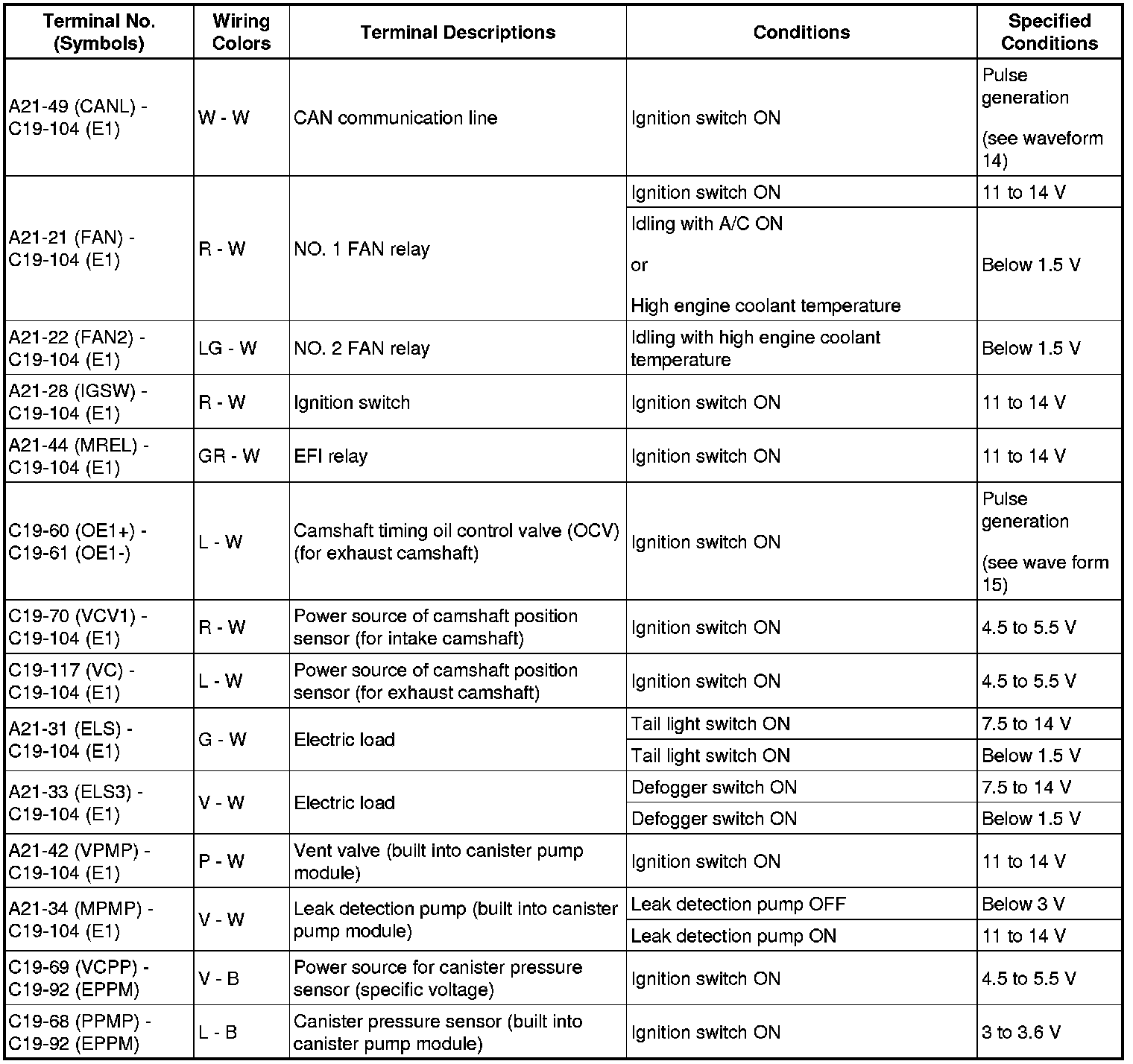 HINT: The standard normal voltage between each pair of the ECM terminals is shown in the table below. The appropriate conditions for checking each pair of the terminals are also indicated. The result of checks should be compared with the standard normal voltage for that pair of the terminals, and displayed in the "Specified Conditions" column. The illustration above can be used as a reference to identify the ECM terminal locations.