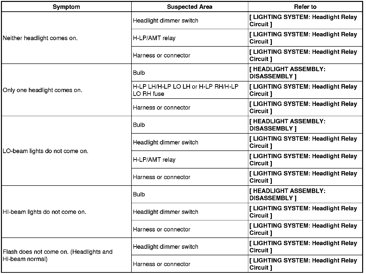 LIGHTING: LIGHTING SYSTEM: PROBLEM SYMPTOMS TABLE