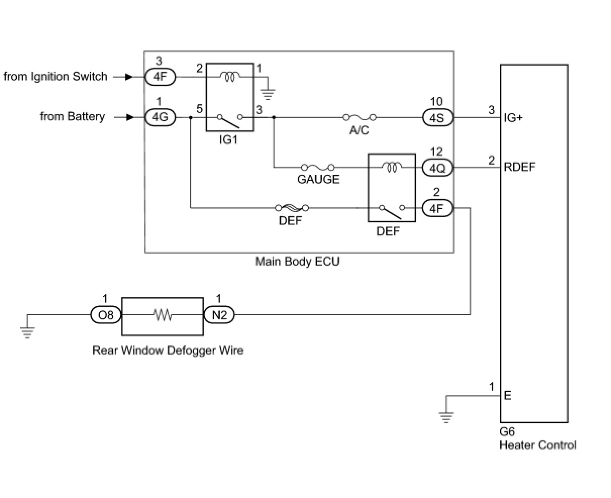 When the rear defogger switch, which is built into the heater control, is operated, the operation signals are transmitted to the DEF relay (coil side). When the DEF relay (coil side) receives the signals, it turns on the DEF relay (switch side) to operate the rear window defogger.